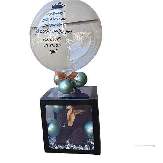 קופסה עם דובי ובלון עם כיתוב אישי ושוקולדים