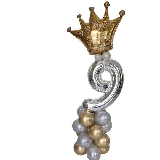 מעמד בלונים מושלם בשילוב בלון מטאלי מושלם ובלוני כרום ועם המספר של החוגג יום הולדת ואיך אפשר בלי הבלון כתר המושלם שלנו להשלמת העיצוב .