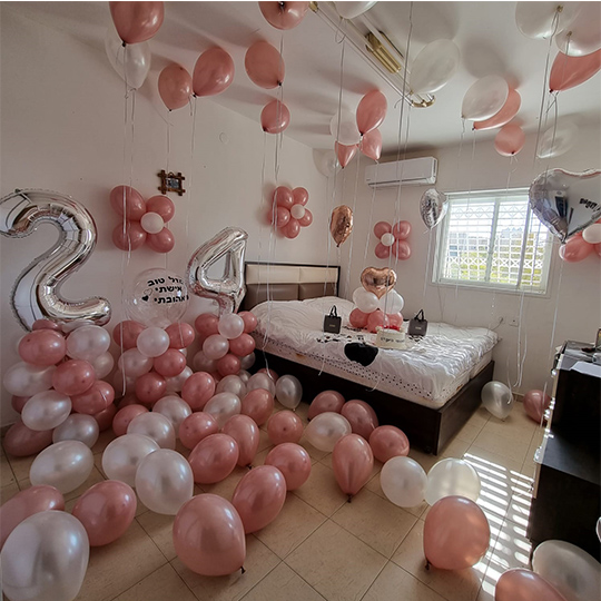 הקישוט מגיע עם בלוני מספרים בשילוב מעמד בלונים עם כיתוב אישי בלוני מנופחים בהליום מפוזרים בתקרה, ובלונים מנופחים באוויר העיצוב המושלם אצלכם בבית .